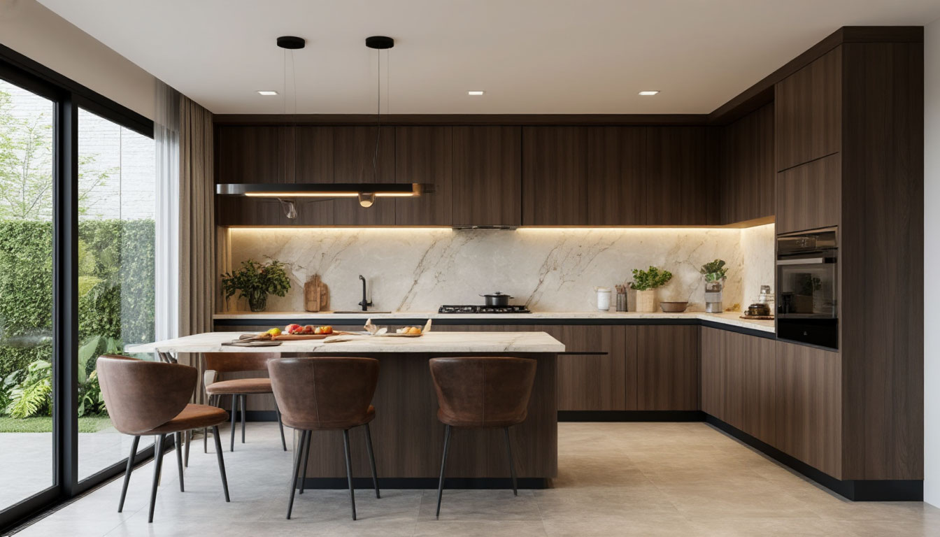 Основной акцент в дизайне кухни Марго сделан на темном дереве, которое придает мебели солидность и характер. Темные тона создают атмосферу уюта и тепла, а текстура дерева добавляет глубину и индивидуальность каждому элементу. Каждая деталь, от фасадов шкафов до ручек, тщательно продумана, чтобы обеспечить не только эстетическое удовольствие, но и максимальное удобство в использовании. Широкие фасады шкафов и выдвижных ящиков предлагают достаточно места для хранения всех необходимых кухонных принадлежностей — от кастрюль и сковородок до посуды и мелкой бытовой техники.