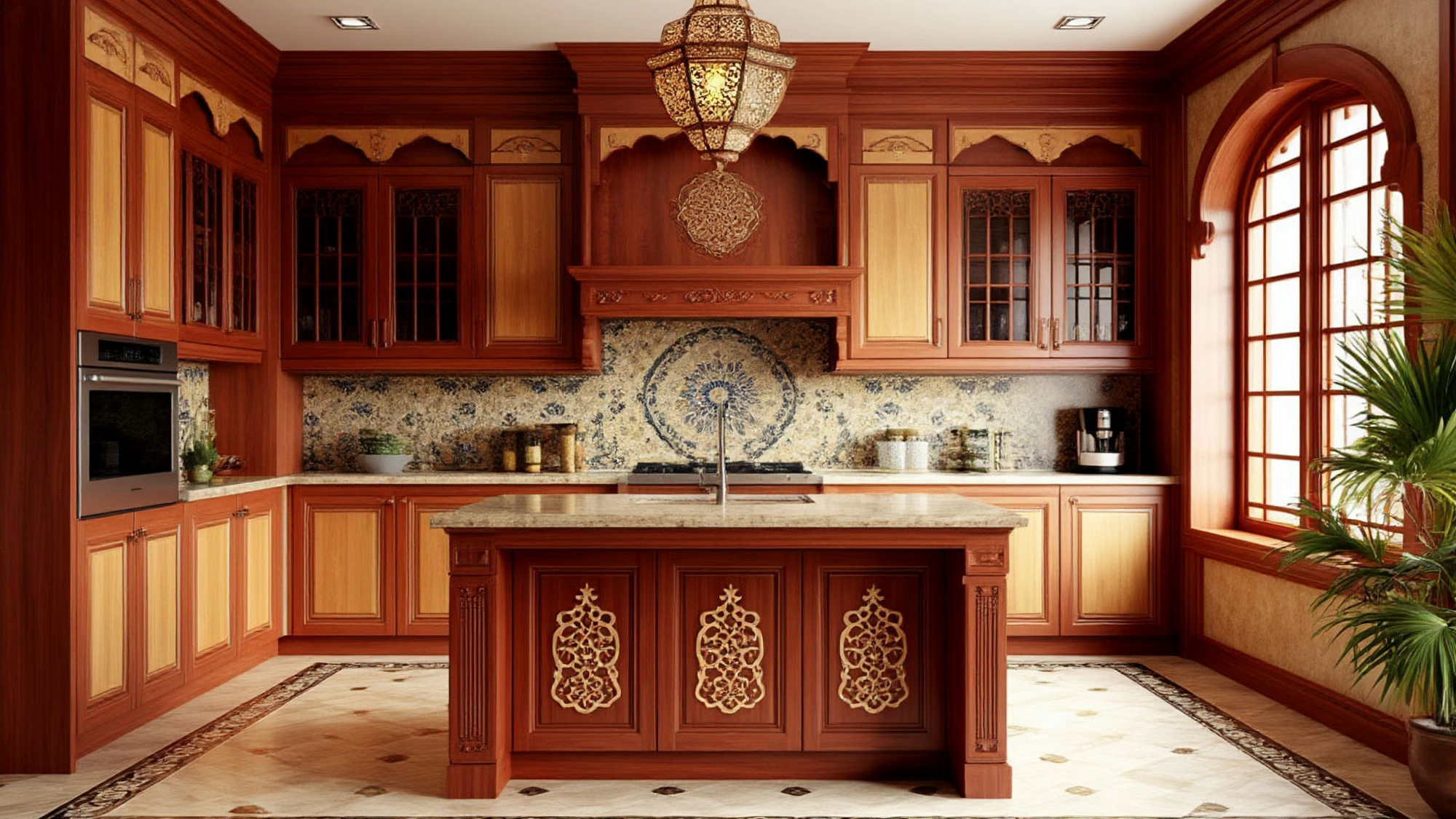 Особое внимание в модели "Шафран" уделено центральной части композиции. Кухня выглядит собранной и симметричной, что характерно для восточной архитектуры и интерьеров. Такое построение пространства создает ощущение порядка и основательности. Кухня воспринимается как единое целое, где каждая зона логично связана с другой, а общий ритм интерьера задается повторяющимися формами и декоративными мотивами.