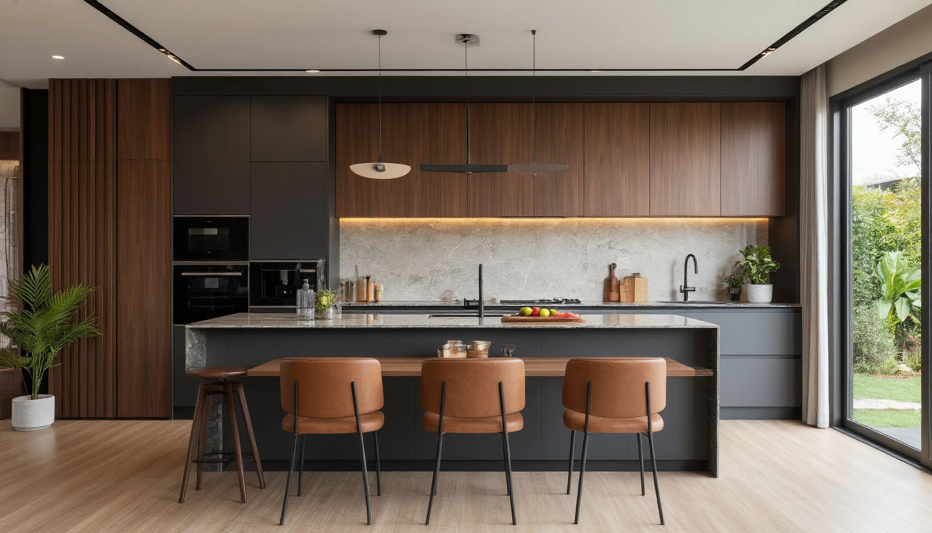 Темно-серые элементы дизайна добавляют современности и строгости, гармонично дополняя общий стиль кухни. Этот контраст между шоколадными фасадами и серыми акцентами создает эффектный визуальный баланс, который делает кухню не только функциональной, но и эстетически привлекательной. Каждый элемент продуман до мелочей, чтобы обеспечить максимальное удобство и комфорт в использовании.