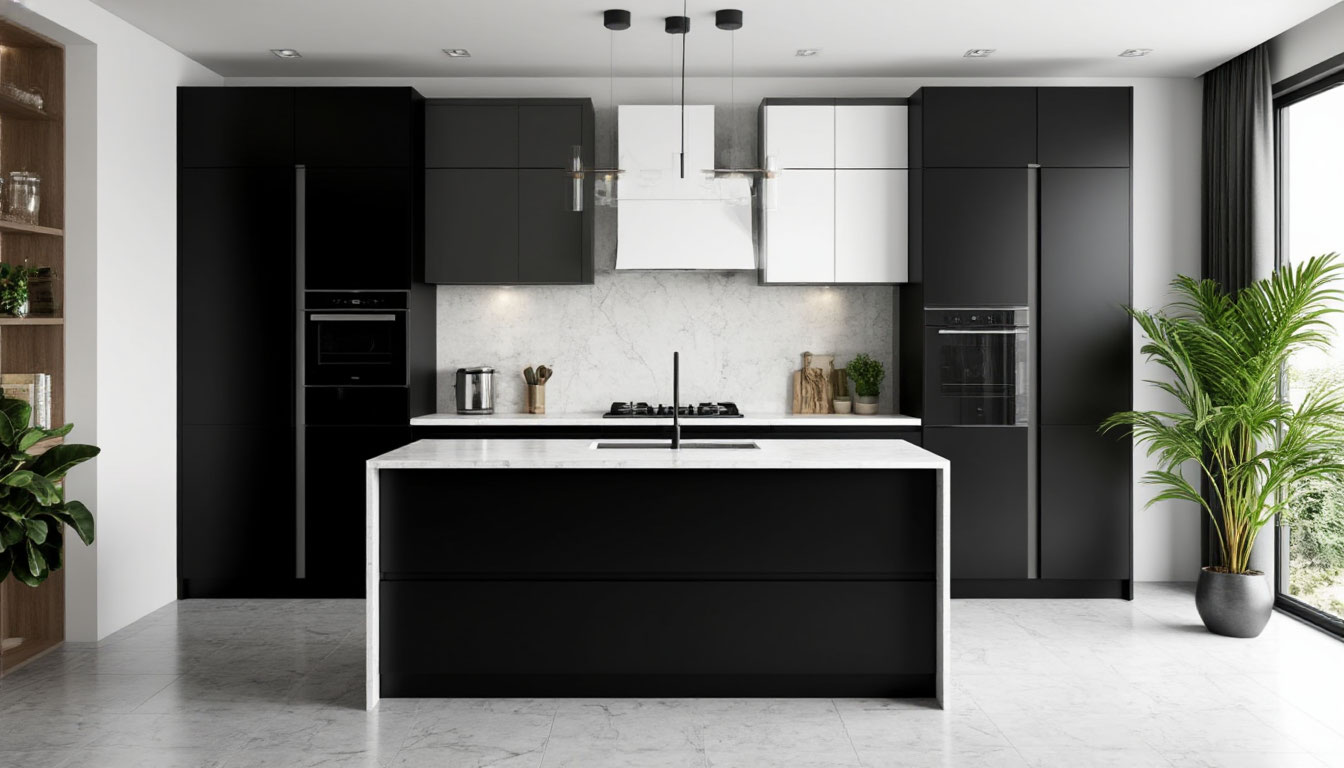 Черные фасады с матовой текстурой придают кухне современный вид, а их глубокий цвет создает эффектный контраст с белыми поверхностями. Это сочетание не только визуально увеличивает пространство, но и добавляет ему глубину и выразительность. Мягкие линии и строгие геометрические формы гармонично сочетаются друг с другом, создавая визуально привлекательный ансамбль. Такой подход к дизайну позволяет легко интегрировать кухню Теодора в различные стили интерьера — от минимализма до классики.